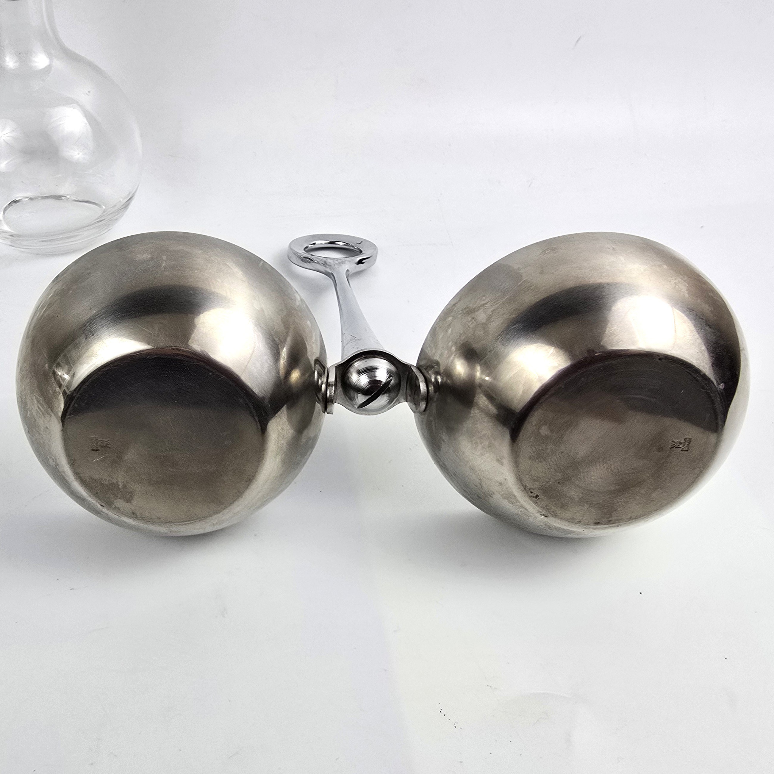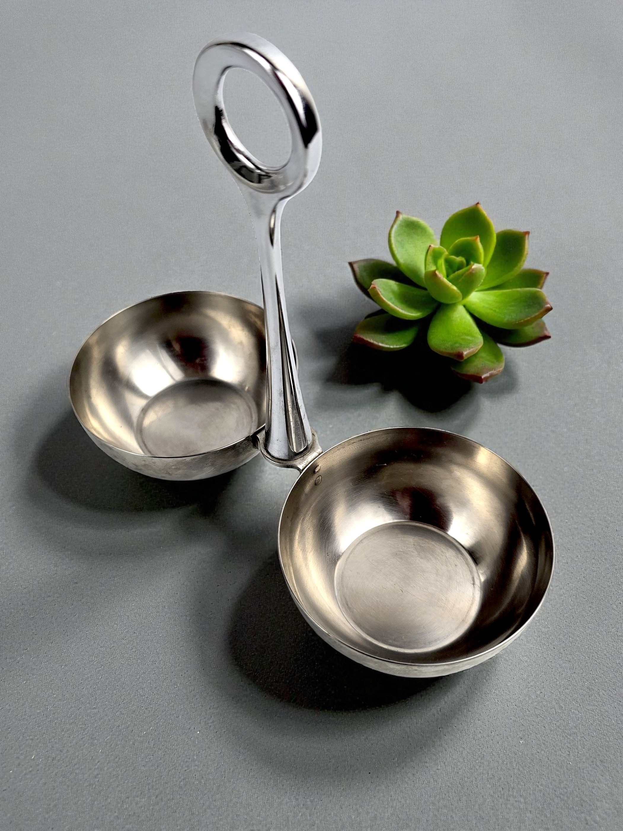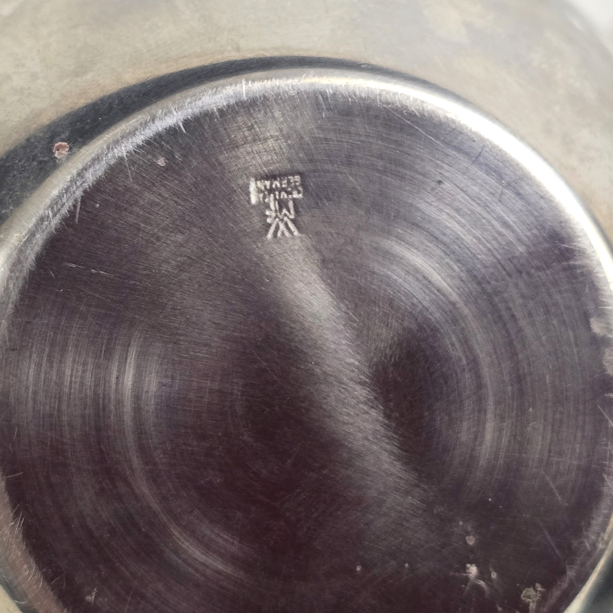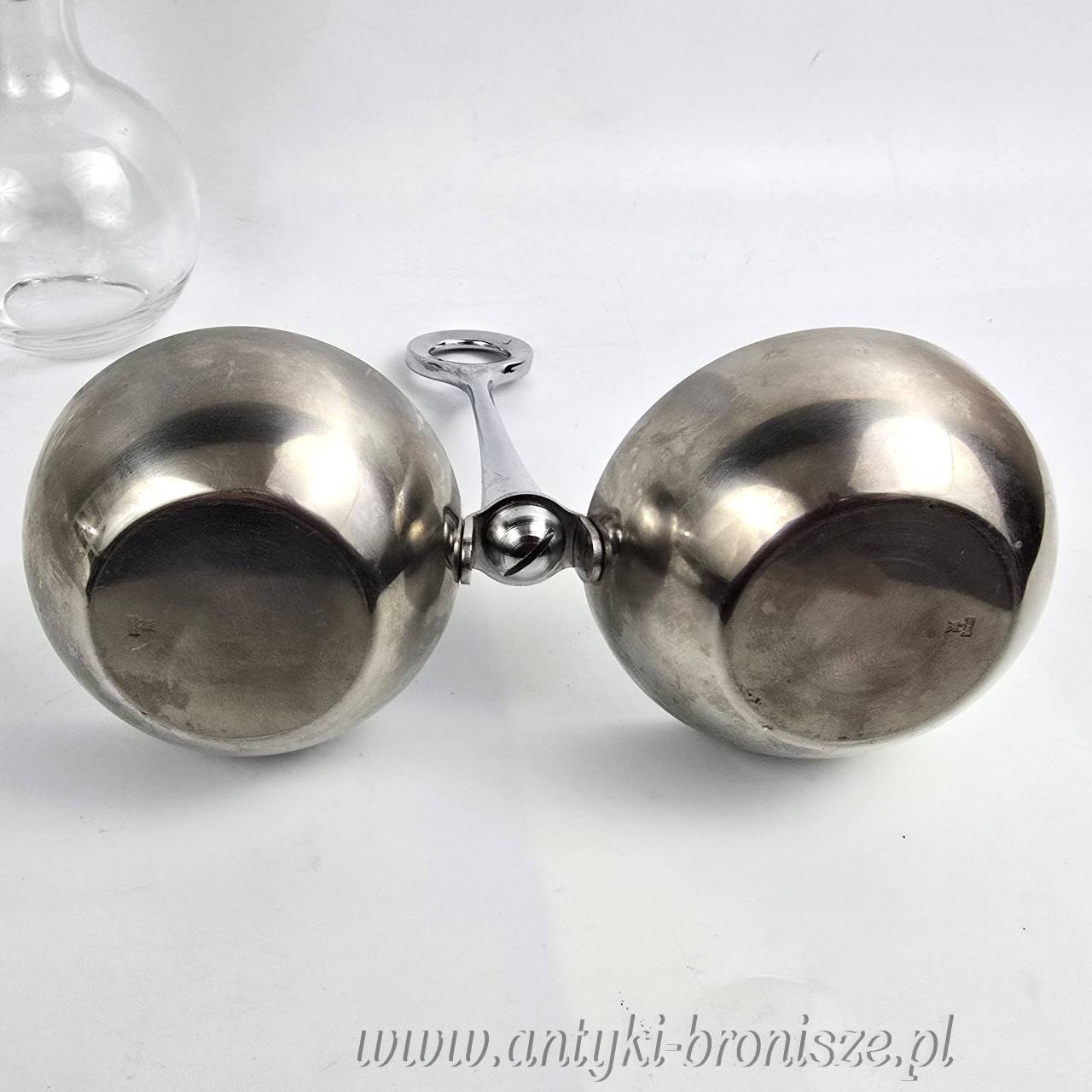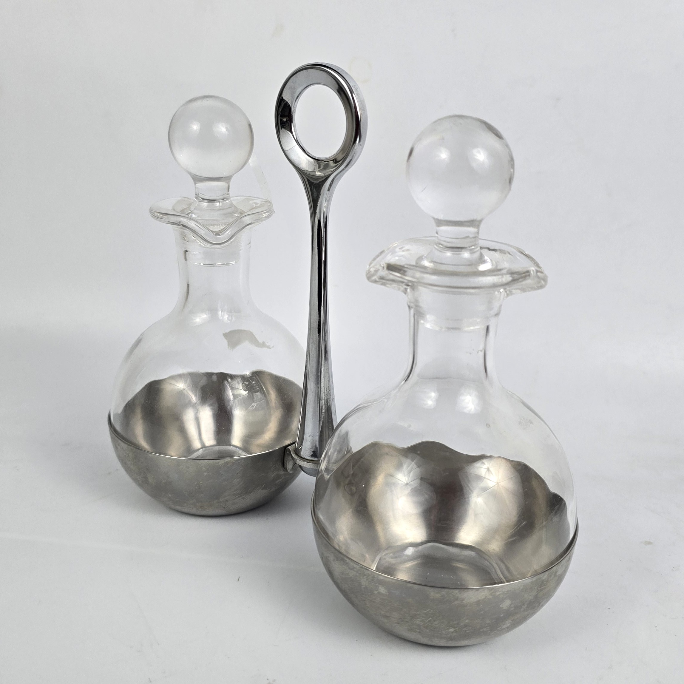 Nowoczesny design z połowy ubiegłego wieku, sygnowany znakiem słynnej niemieckiej wytwórni WMF. Zestaw składa się ze szklanych butelek z korkami umieszczonych w stojaku wykonanym z wysokiej jakości stali nierdzewnej Cromargan ( patent WMF od 1930r. ).