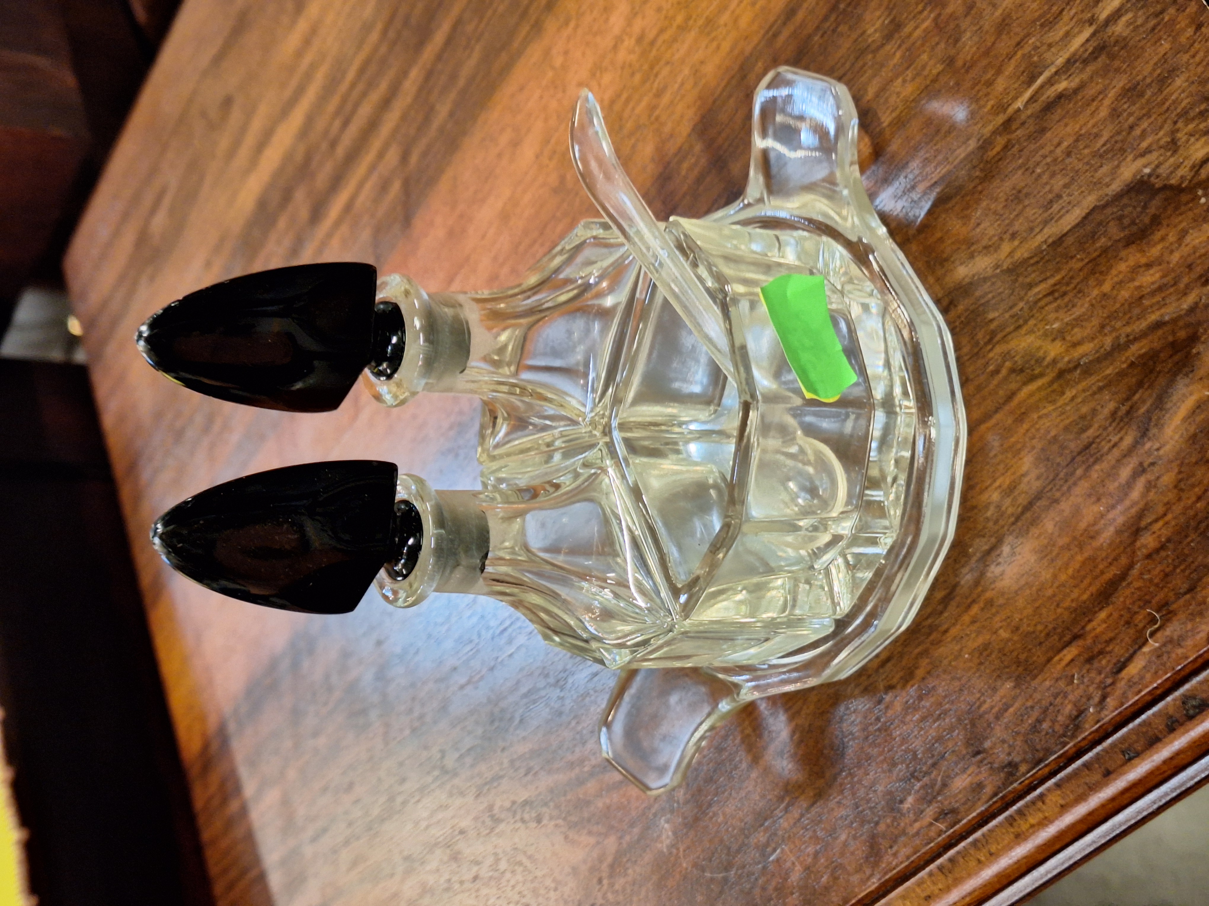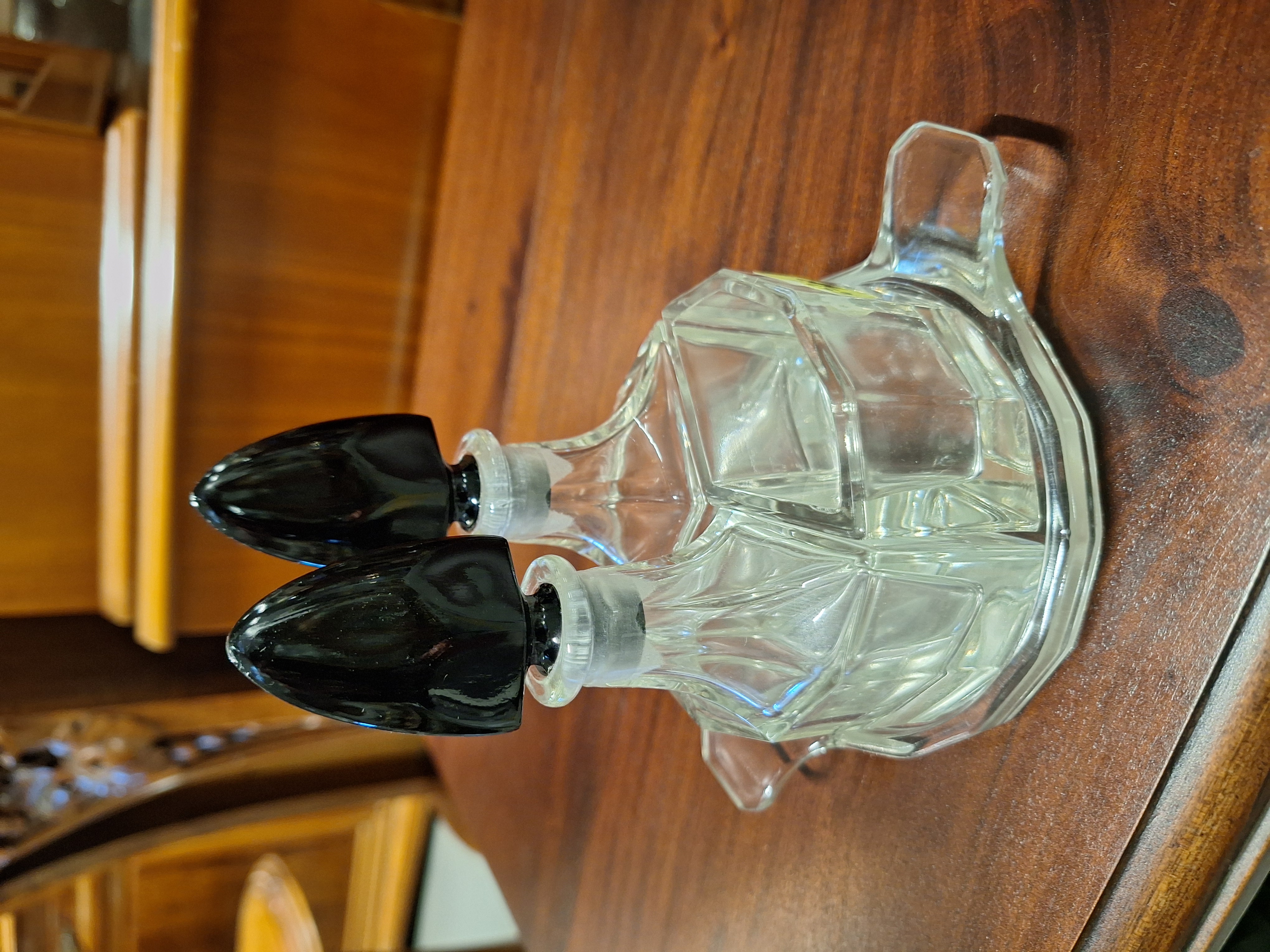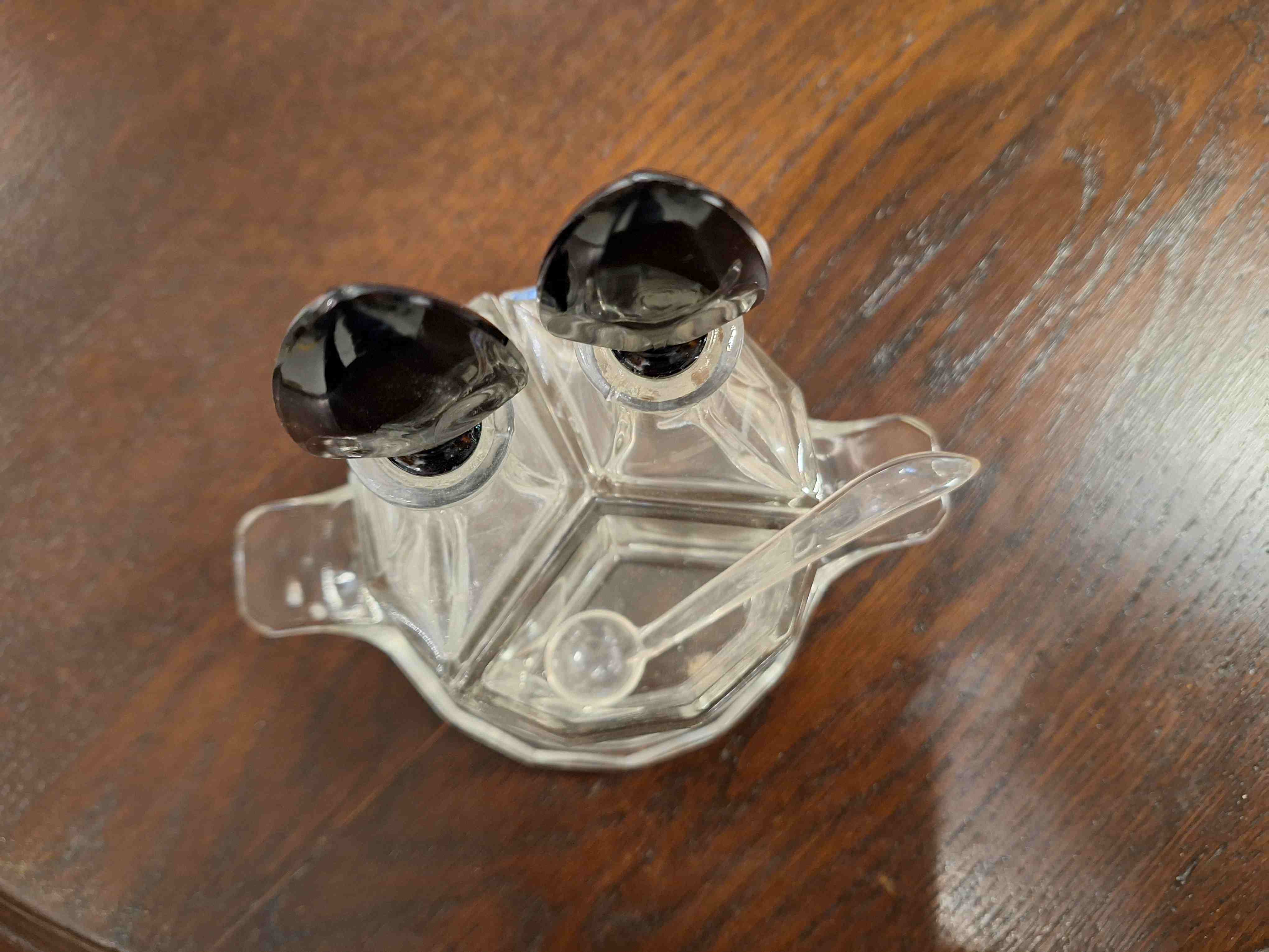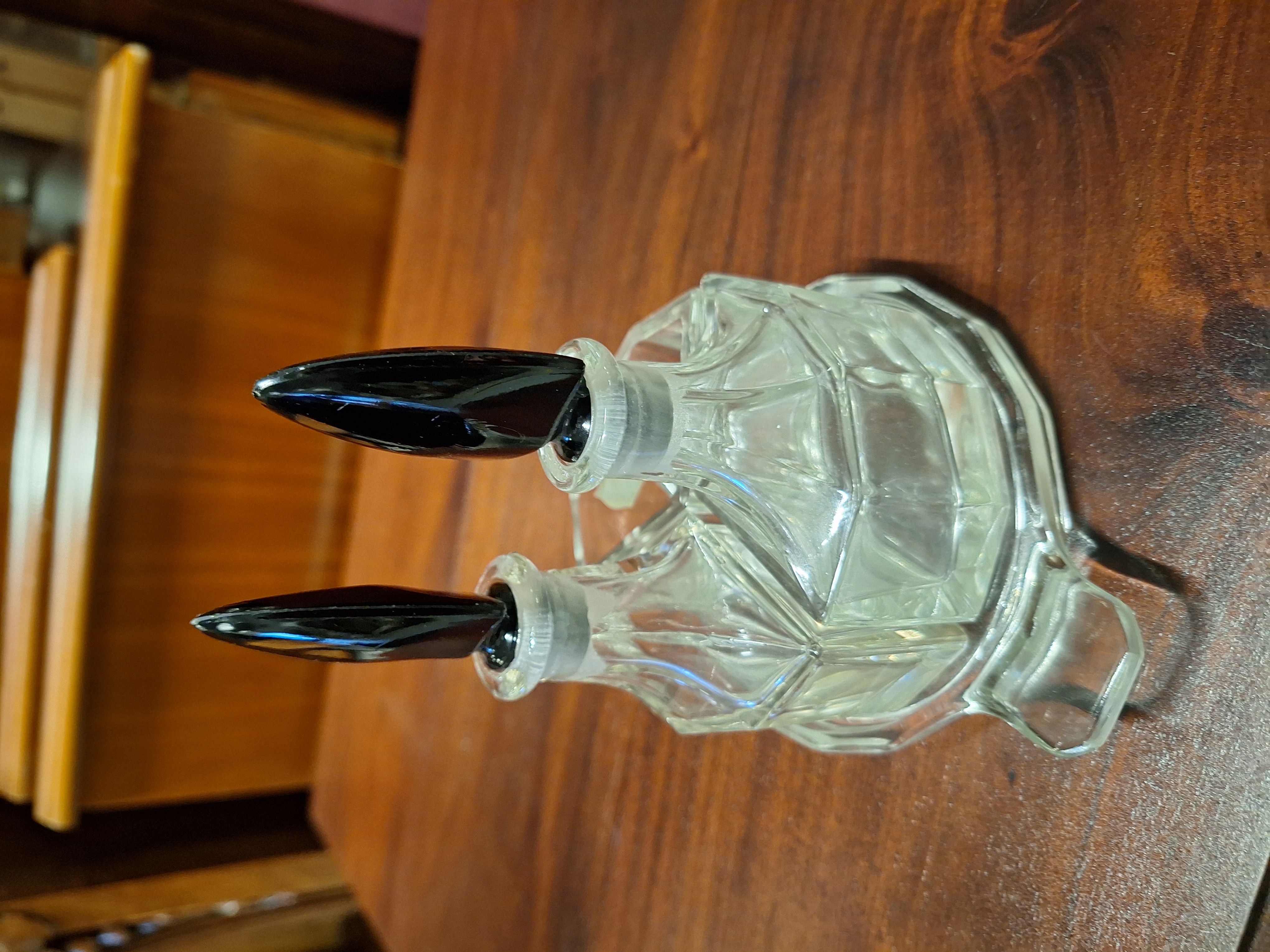 4321 - Zestaw oliwa/ocet - 3 szklane pojemniki Art Déco, 2 z czarnymi korkami na szklanej tacce