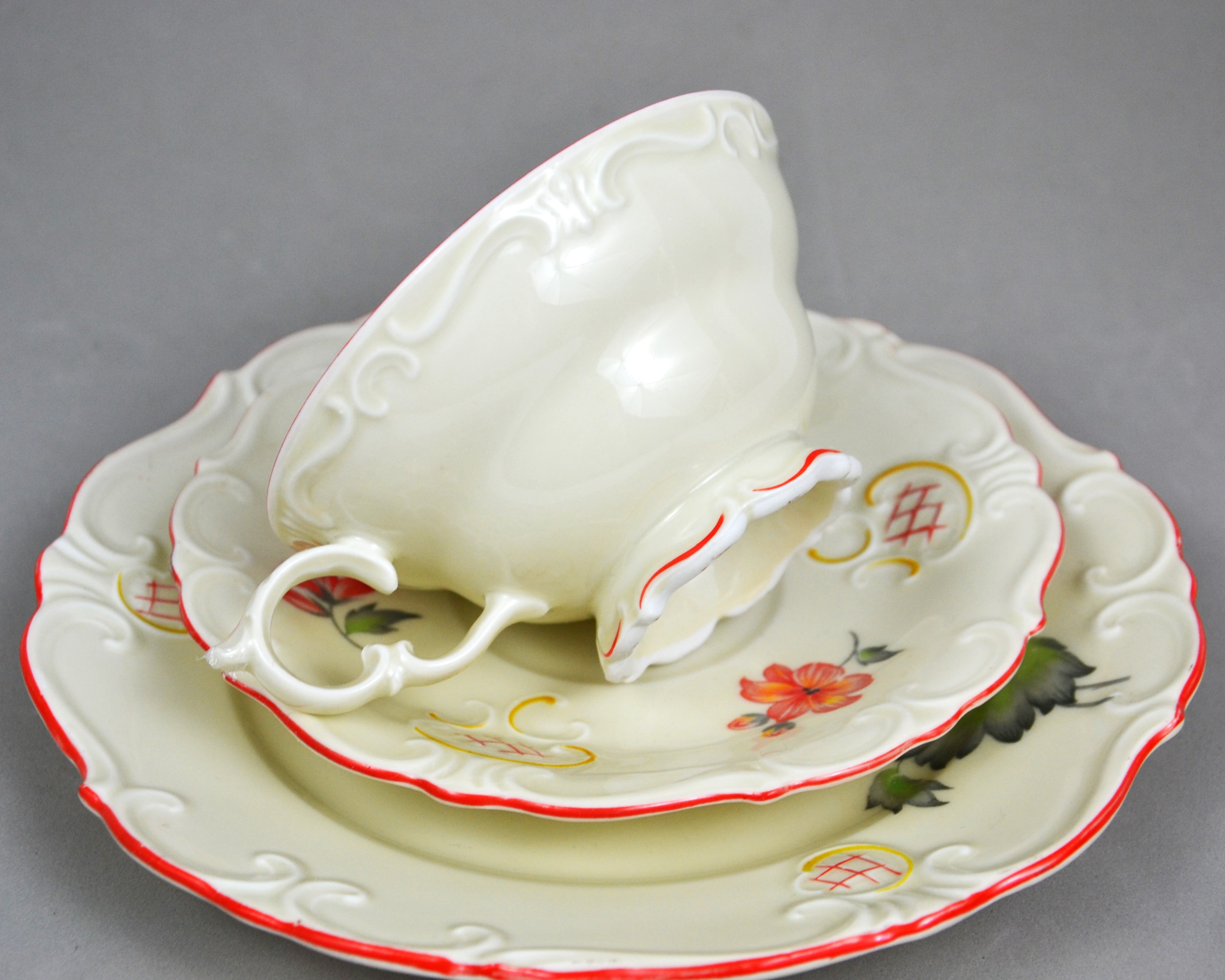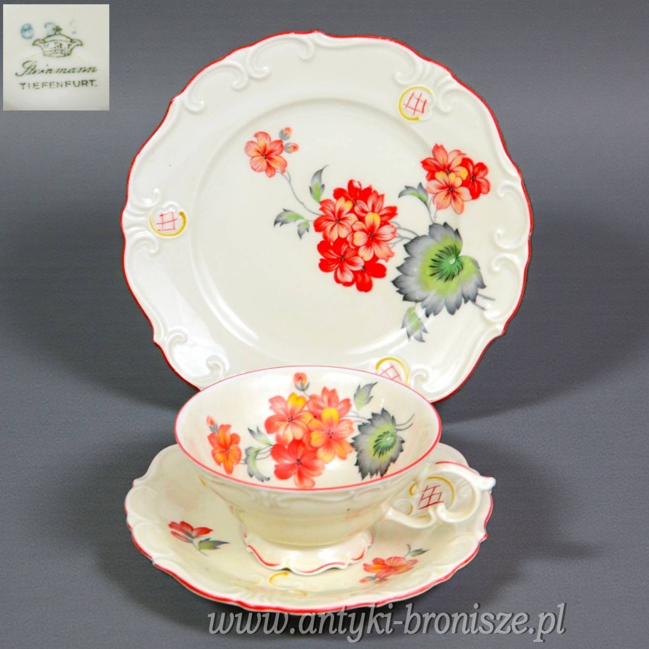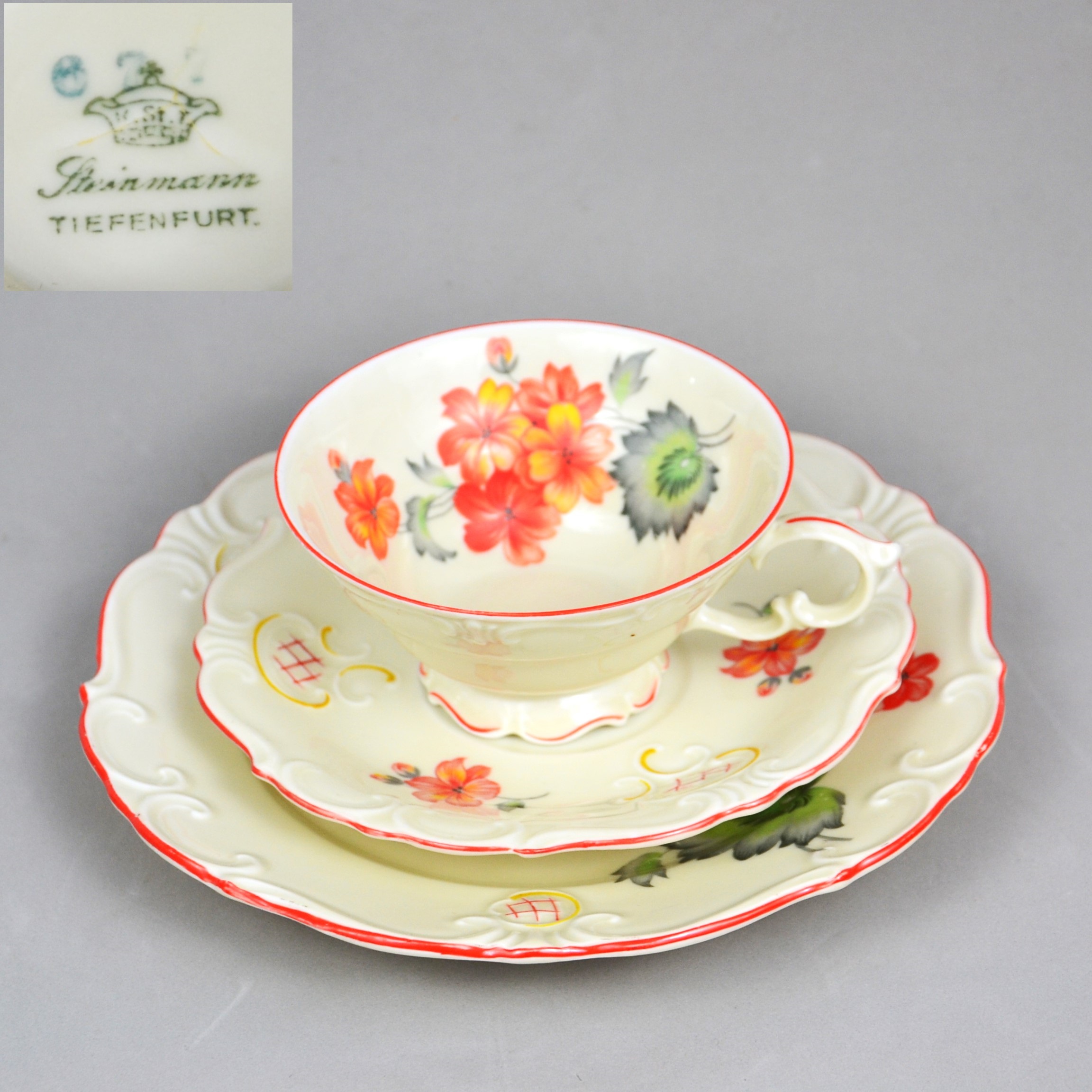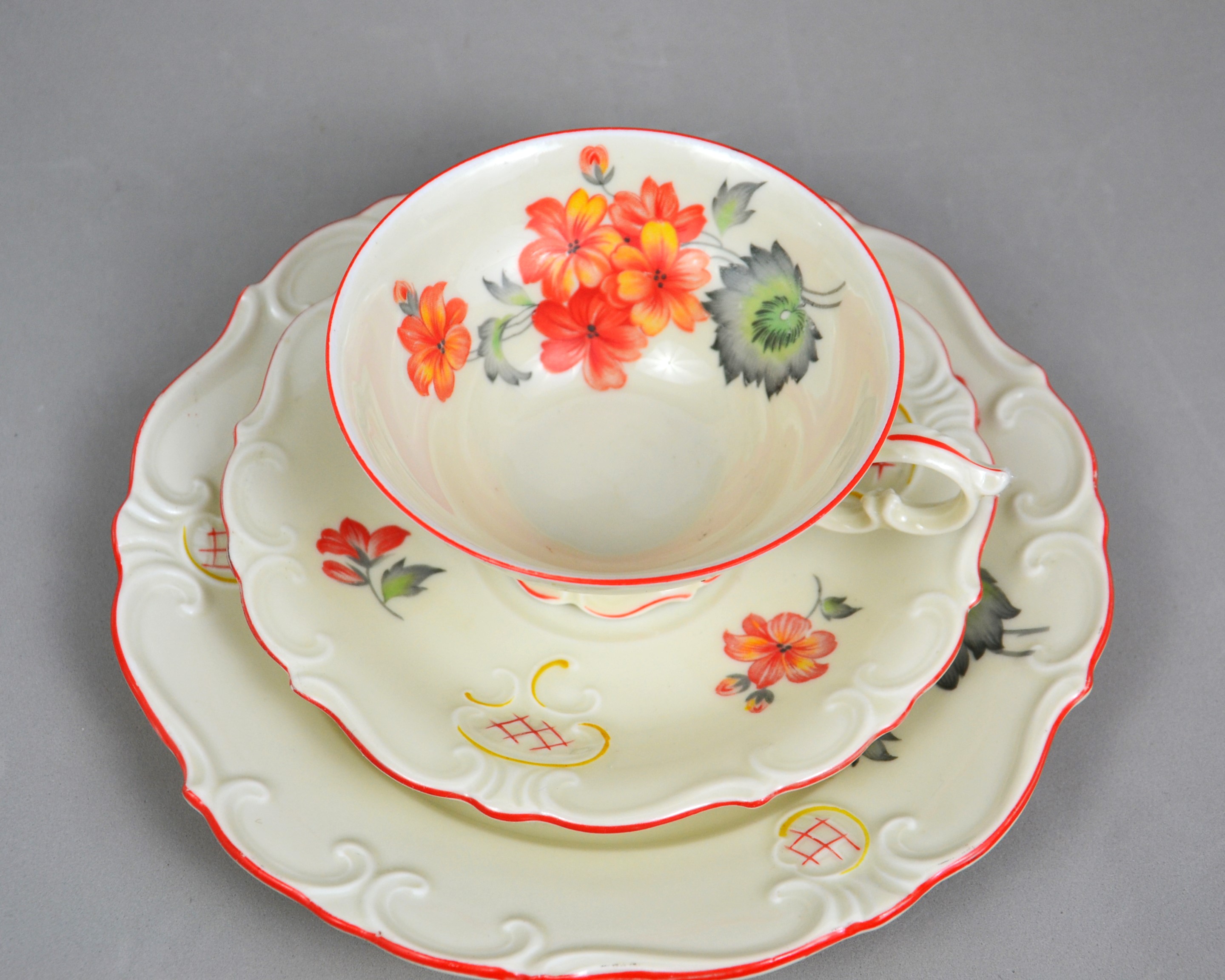 Wytworny zestaw śniadaniowy sygnowany znakiem śląskiej wytwórni K.Steinmann Porzellanfabriken Tiefenfurt (Parowa) lata 20/30te. Porcelana ecru ozdobiona dużym motywem kwiatowym w pomarańczowo czerwonej kolorystyce. Elegancka forma - filiżanka na niskiej stopce rozszerzająca się na górze, finezyjnie wyprofilowane uszko, talerzyki z lekko falistymi krawędziami, całość dekorowana wyrazistymi reliefami, ranty wykończone pomarańczową kreską
