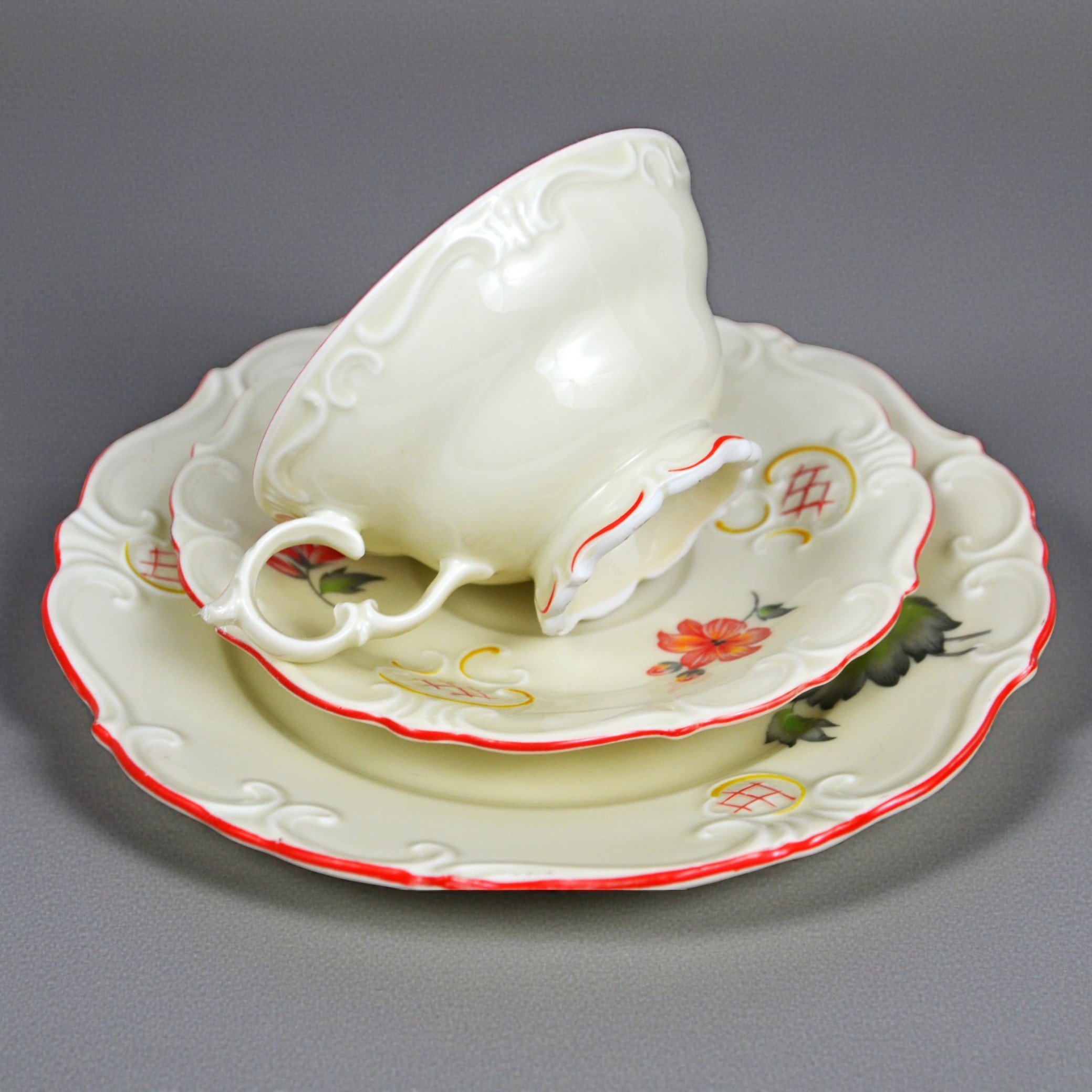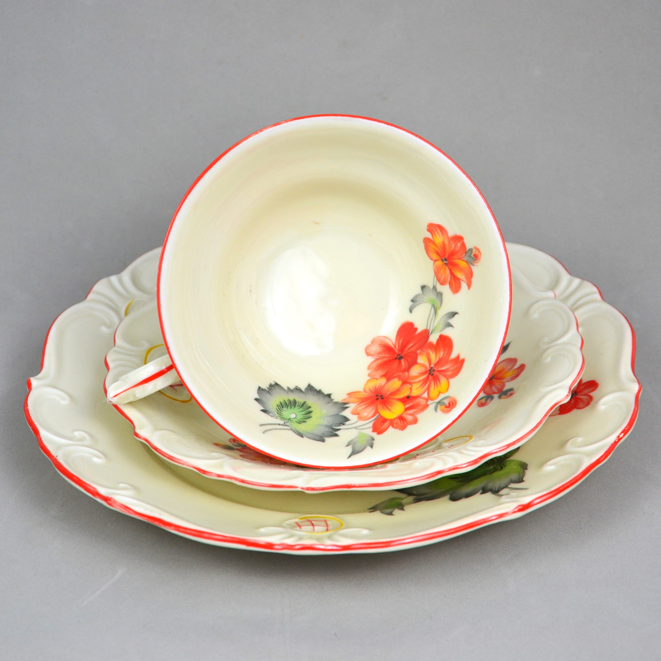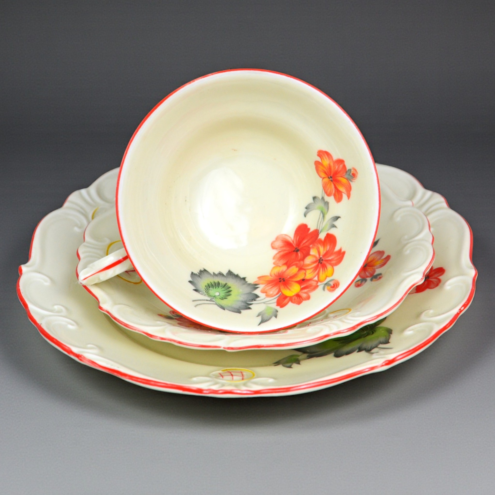 Wytworny zestaw śniadaniowy sygnowany znakiem śląskiej wytwórni K.Steinmann Porzellanfabriken Tiefenfurt (Parowa) lata 20/30te. Porcelana ecru ozdobiona dużym motywem kwiatowym w pomarańczowo czerwonej kolorystyce. Elegancka forma - filiżanka na niskiej stopce rozszerzająca się na górze, finezyjnie wyprofilowane uszko, talerzyki z lekko falistymi krawędziami, całość dekorowana wyrazistymi reliefami, ranty wykończone pomarańczową kreską