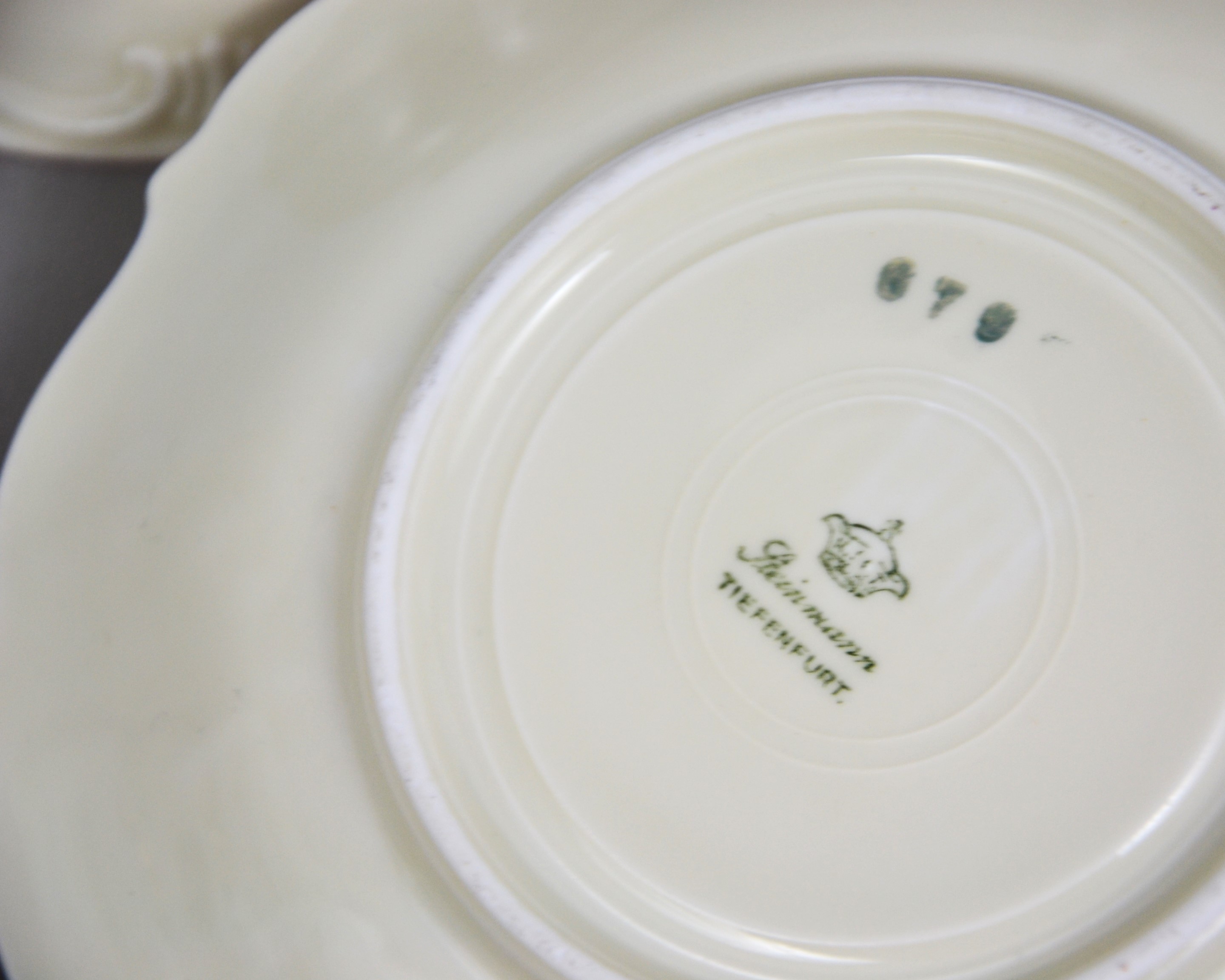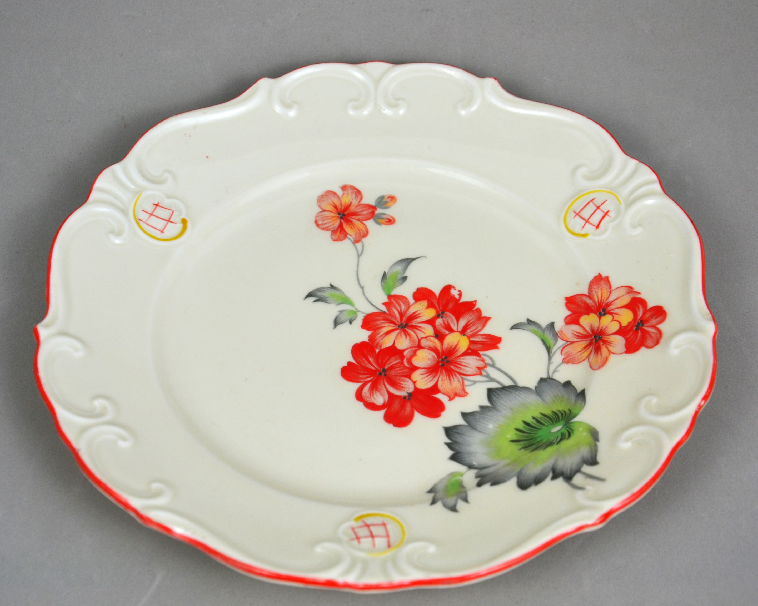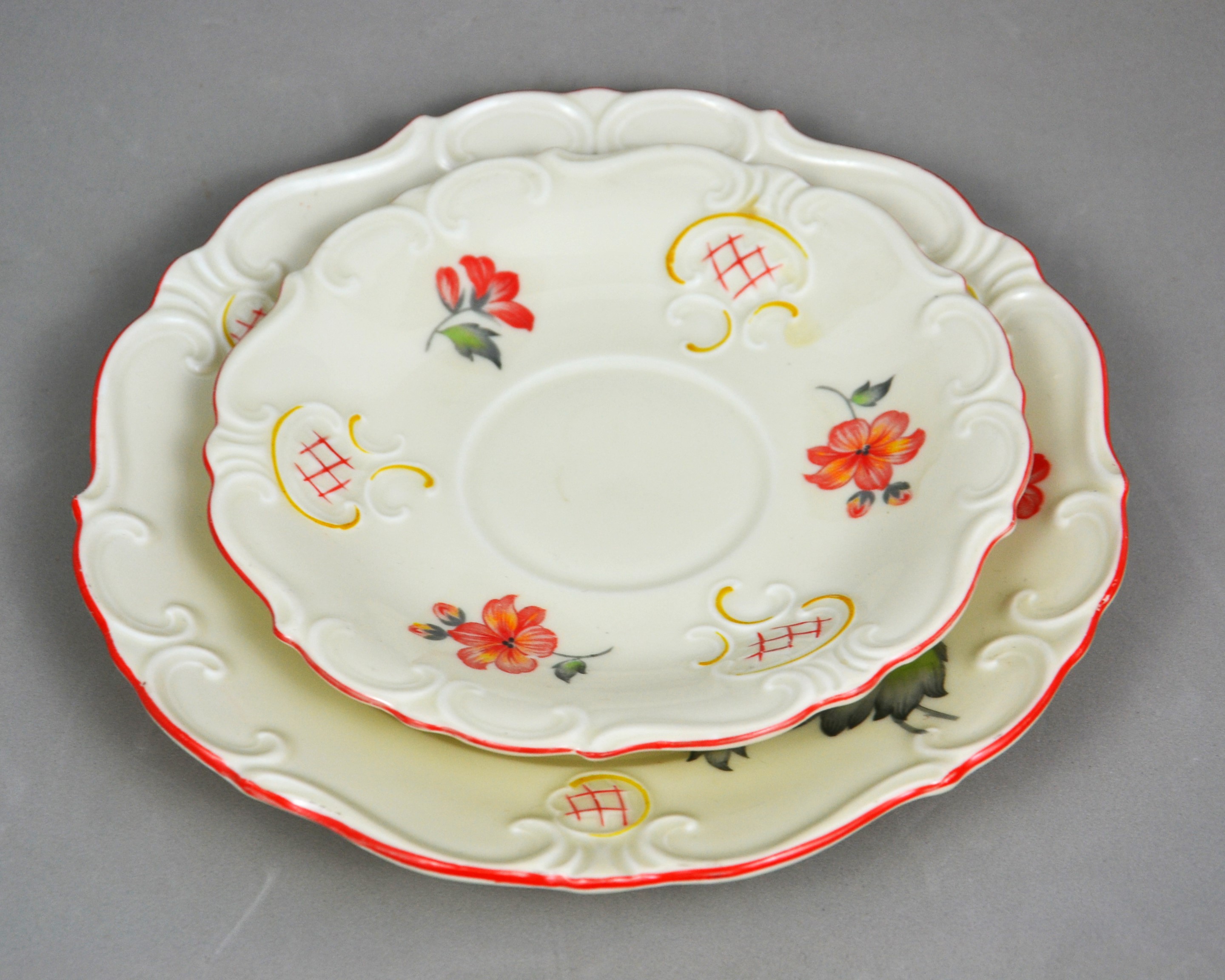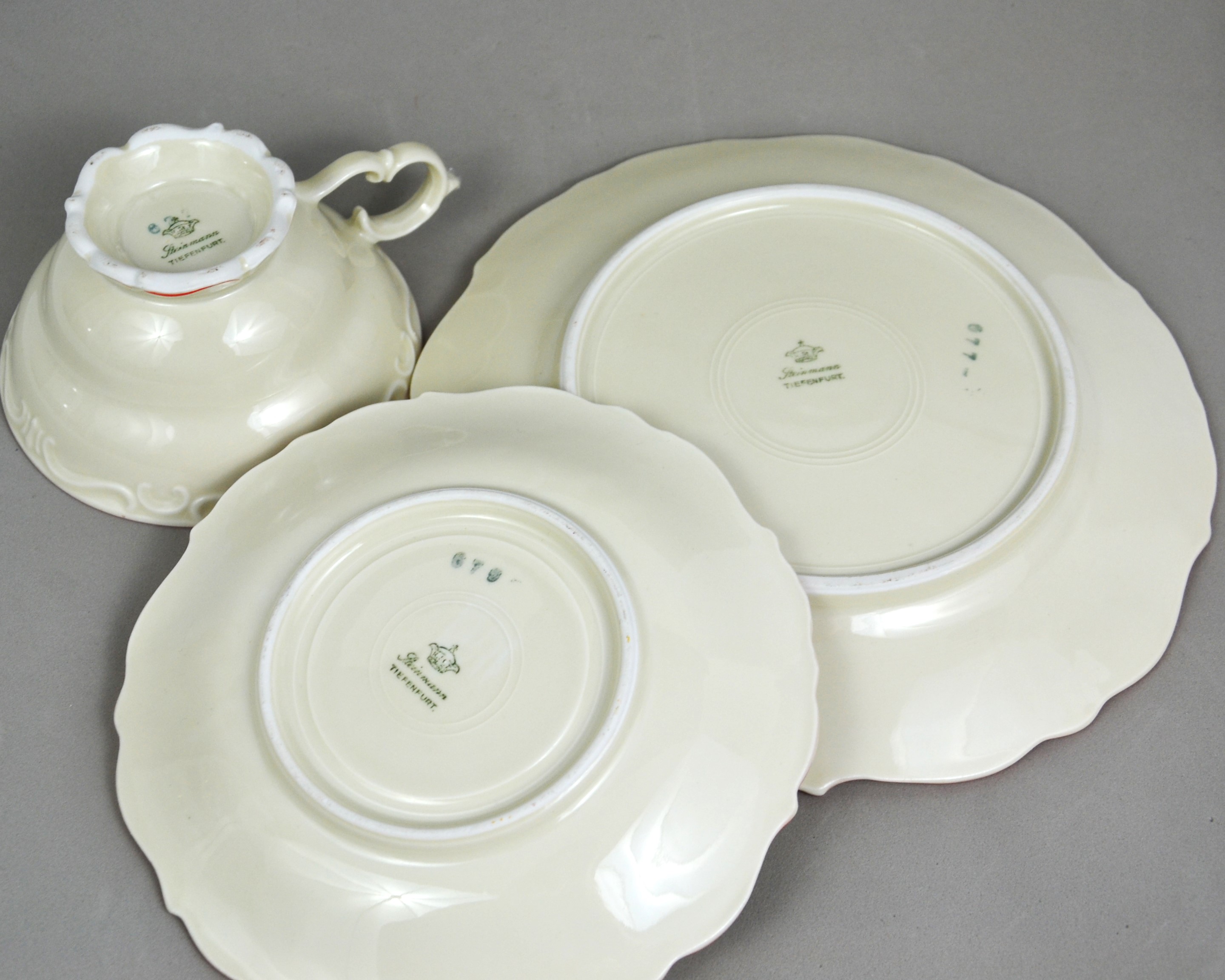 Wytworny zestaw śniadaniowy sygnowany znakiem śląskiej wytwórni K.Steinmann Porzellanfabriken Tiefenfurt (Parowa) lata 20/30te. Porcelana ecru ozdobiona dużym motywem kwiatowym w pomarańczowo czerwonej kolorystyce. Elegancka forma - filiżanka na niskiej stopce rozszerzająca się na górze, finezyjnie wyprofilowane uszko, talerzyki z lekko falistymi krawędziami, całość dekorowana wyrazistymi reliefami, ranty wykończone pomarańczową kreską