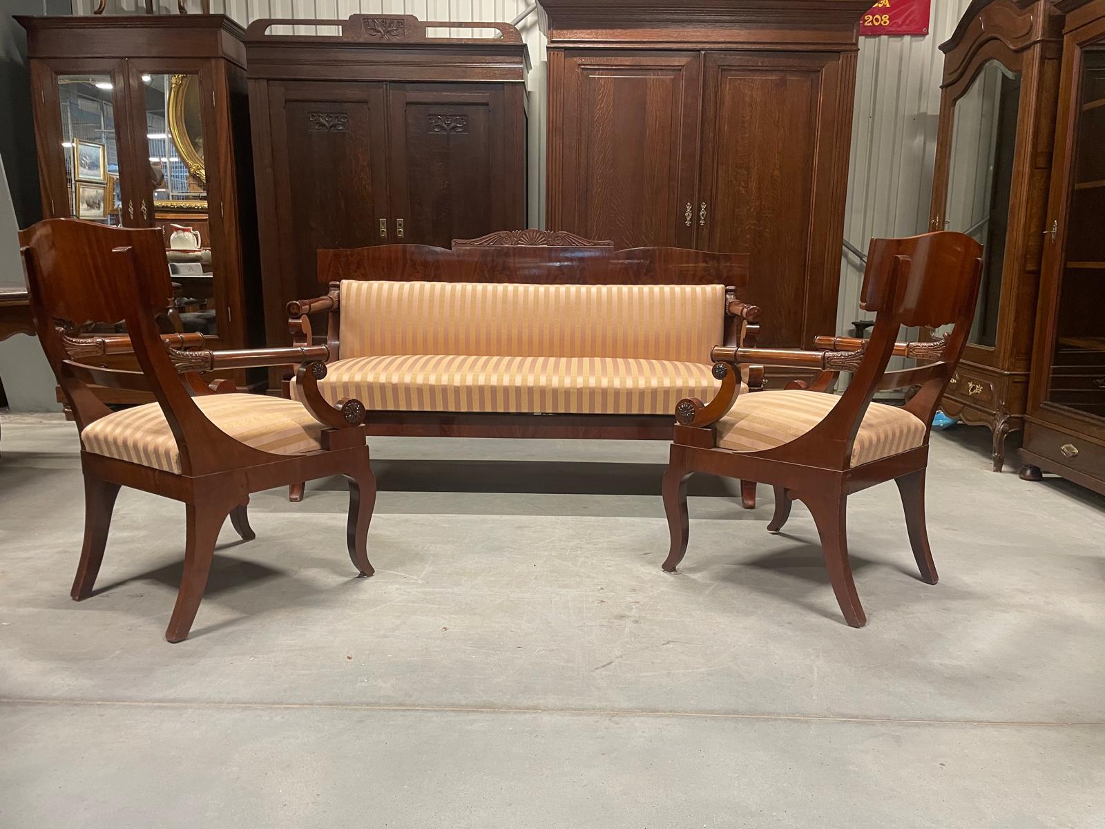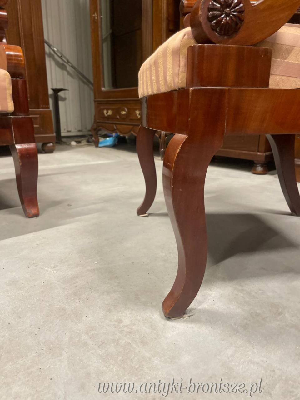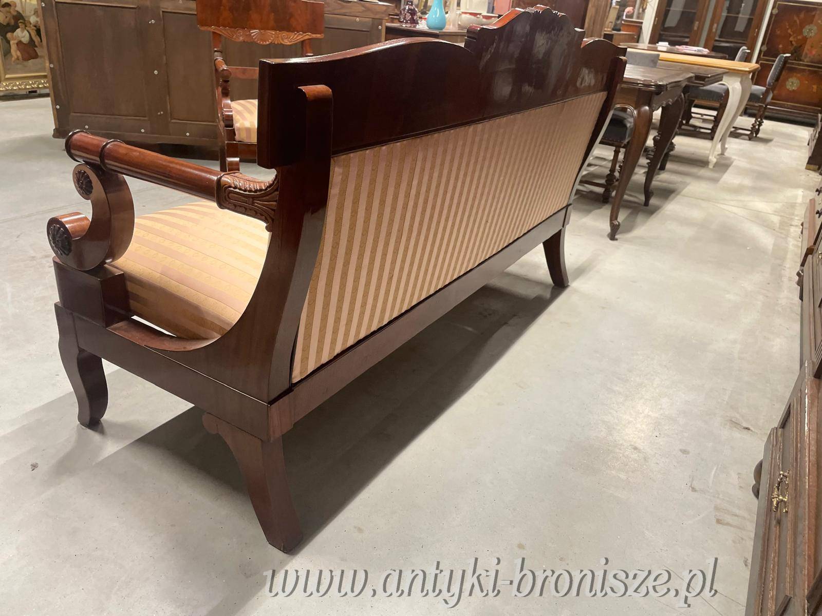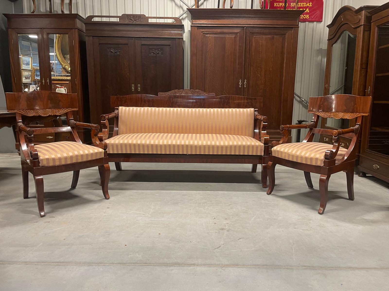 Elegancki komplet mebli wypoczynkowy w stylu Biedermeier. Składający się z kanapy oraz dwóch foteli. Komplet został wyprodukowany w Polsce ok 1880 roku. Konstrukcja kompletu jest wykonana z mahoniu. Siedziska oraz oparcie w kanapie jest miękkie i obite jasnym materiałem tapicerskim.