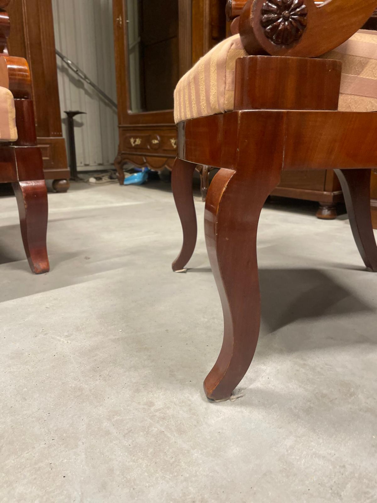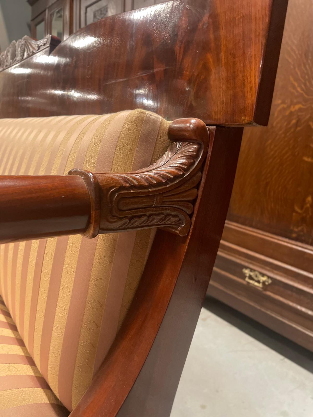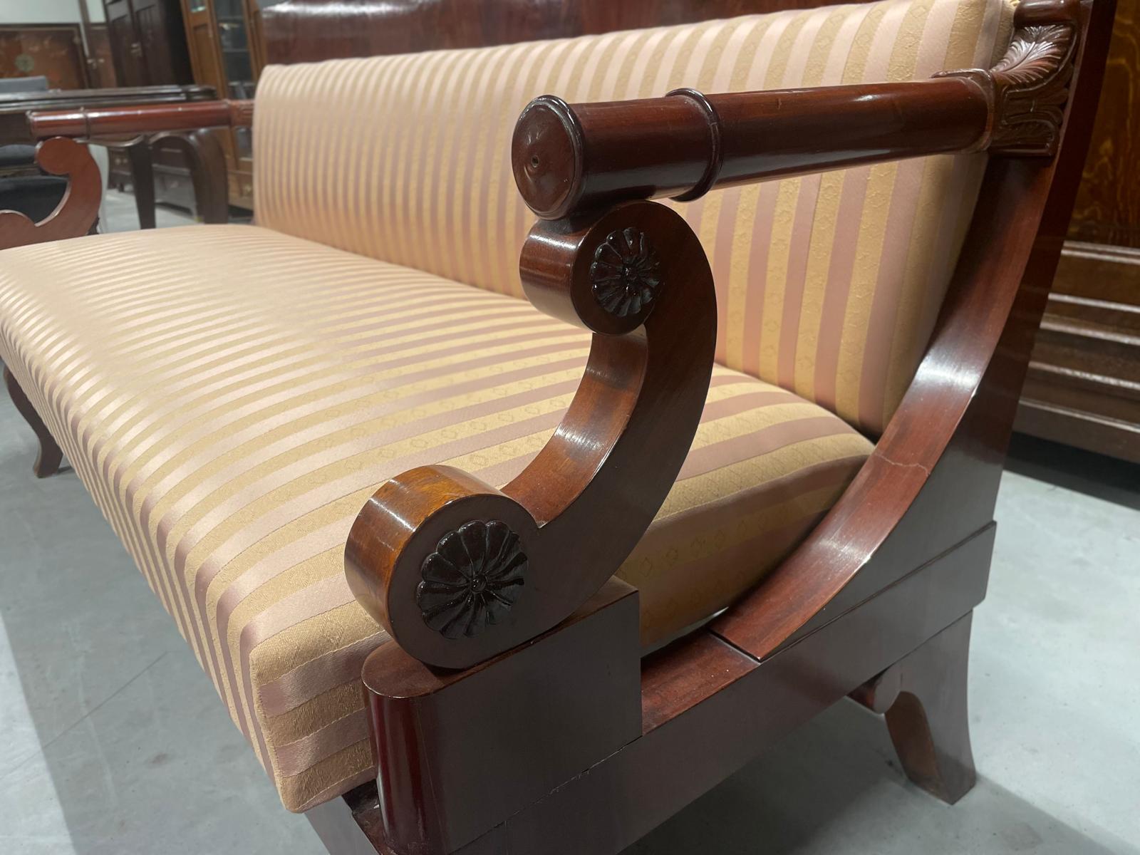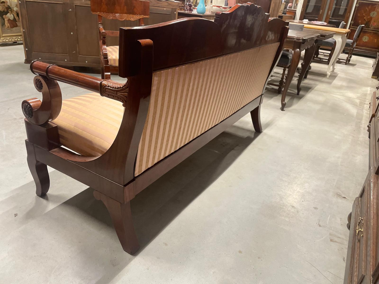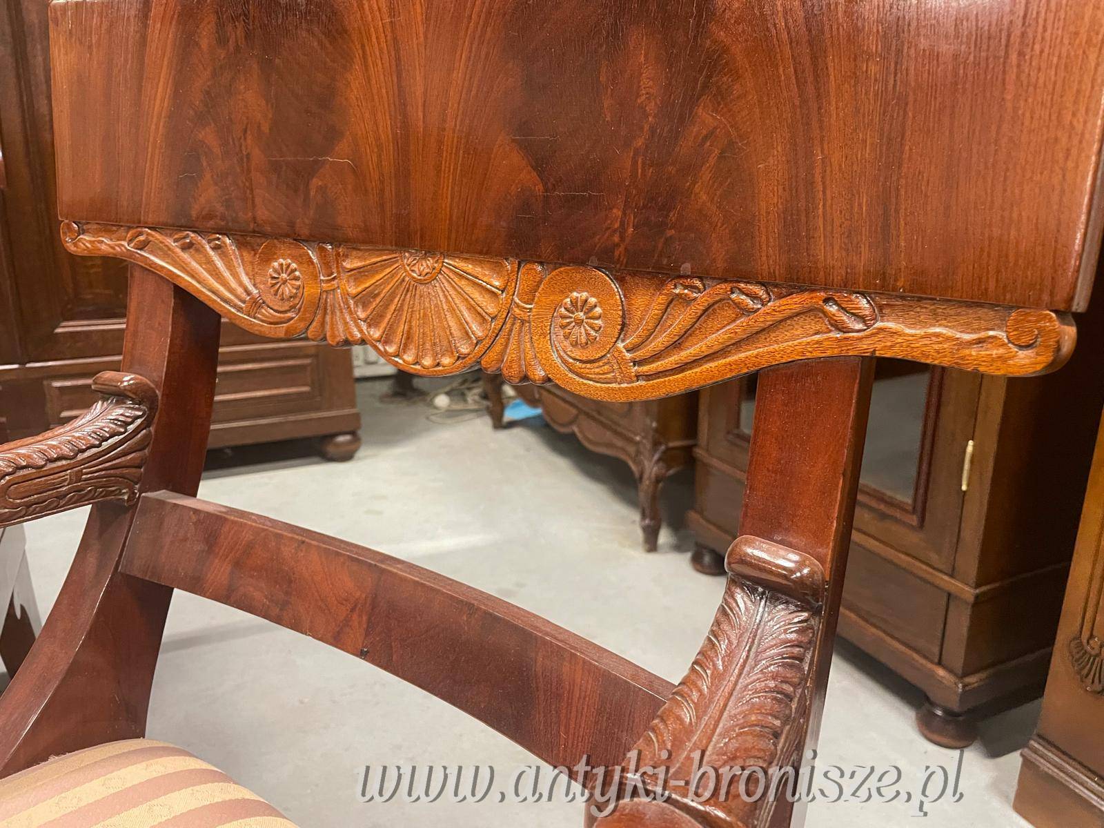 Elegancki komplet mebli wypoczynkowy w stylu Biedermeier. Składający się z kanapy oraz dwóch foteli. Komplet został wyprodukowany w Polsce ok 1880 roku. Konstrukcja kompletu jest wykonana z mahoniu. Siedziska oraz oparcie w kanapie jest miękkie i obite jasnym materiałem tapicerskim.